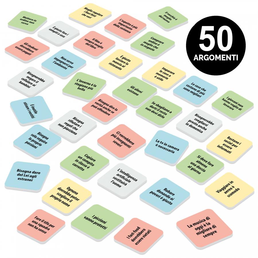 50 cartine Tesi-Antitesi; 8 palette voto; 1 scheda struttura del discorso; Regolamento