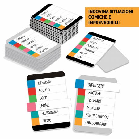 Un leone che dipinge, un pizzaiolo che si trucca, una gallina innamorata... Siete capaci di mimare e far indovinare una serie di soggetti in situazioni imprevedibili? Un gioco che allena le vostre capacità espressive e che vi farà ridere a crepapelle!