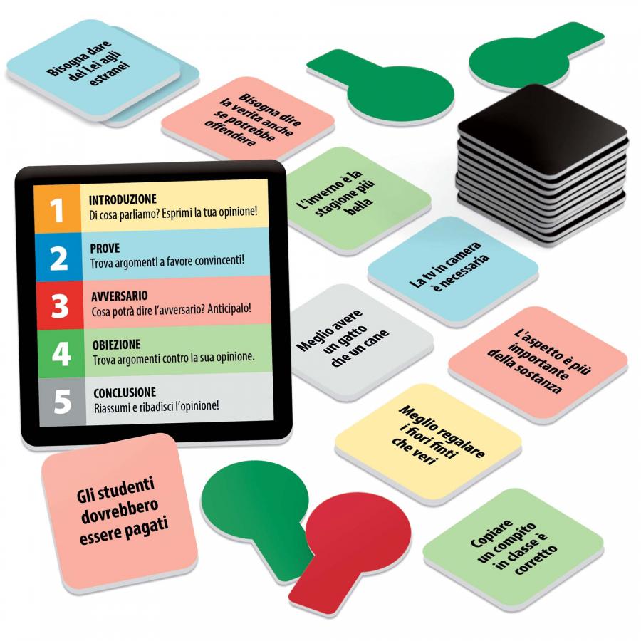 50 cartine Tesi-Antitesi; 8 palette voto; 1 scheda struttura del discorso; Regolamento