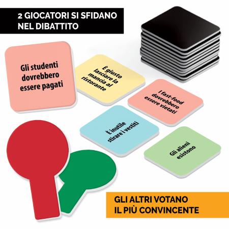 Dibattito è un party game divertente per tutte le età che allena le capacità dialettiche e di pensiero critico. I concorrenti devono sostenere opinioni insolite e divertenti, che non necessariamente rispecchiano la loro reali convinzioni. Il segreto per vincere? Avere una buona dialettica ed essere chiari e convincenti!